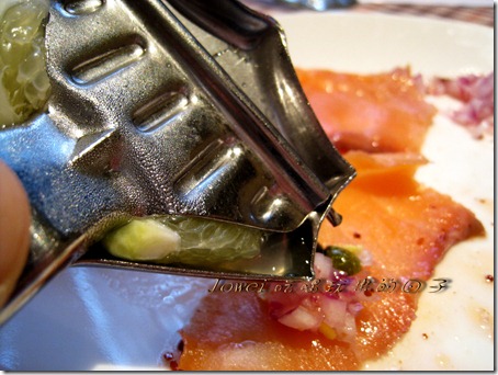 挪威燻鮭魚盤,捲成花朵狀的鮭魚很漂亮,視覺上不賴~燻鮭魚的品質不錯,橘紅色的魚肉還保有彈性,沒有死鹹的味道,洋蔥、酸豆及檸檬片等配料一樣不少~